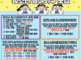 당진·합덕·송악청소년문화의집에서는 당진시 청소년 참여기구(당진시 청소년참여위원회, 당진·합덕·송악청소년운영위원회, 당진시 청소년어울림마당기획단) 신규 위원을 모집한다.