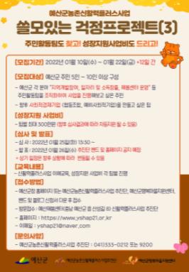 군 관계자는 “예산군농촌신활력플러스사업으로 진행하는 가장 기초단계 지원사업인 쓸모 있는 걱정프로젝트가 이번을 마지막으로 종료되는 만큼 지역개발사업 참여 및 지역활성화에 기여할 수 있는 5인 이상 다양한 주민활동팀의 많은 관심과 참여를 부탁드린다”고 당부했다.