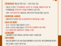 모집기간은 오는 21일까지로 홈페이지, 이메일, 방문접수(예산읍 산성길8, 예산해봄센터) 등을 통해 신청할 수 있으며, 모집분야는 △지역개발참여 △일자리 및 소득창출 △해봄센터 내 공간운영 등 3분야로 5인 이상 구성된 모임, 마을단체, 사회적기업, 협동조합, 마을기업 등 군민 누구나 신청할 수 있다.