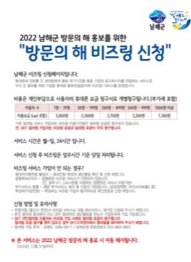 남해군은 2022 남해군 방문의 해를 널리 알리는 비즈링 서비스를 2022년 12월 31일까지 운영한다고 밝혔다.