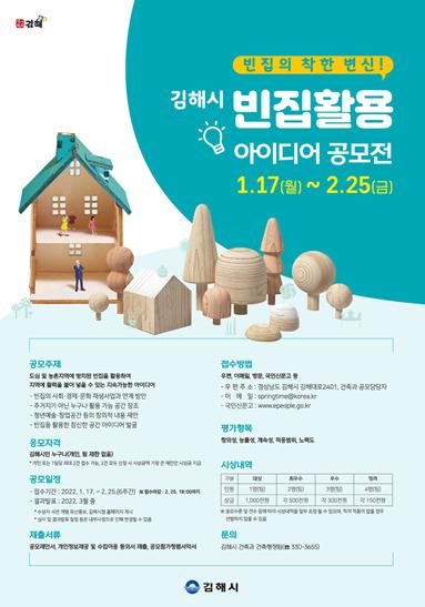 공모전 주제는 ‘도심 및 농촌지역에 방치된 빈집을 활용하여 지역에 활력을 불어 넣을 수 있는 지속가능한 아이디어’로 ▲빈집의 사회·경제·문화 재생사업과 연계방안 ▲청년예술·창업공간 등 누구나 활용 가능한 창의적 내용 ▲주거지가 아닌 누구나 활용 가능한 공간 창조 등 빈집을 활용한 참신한 아이디어를 가진 김해시민이면 누구나 참가할 수 있다.
