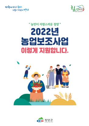 청양군이 2022년 농업 보조사업 적기 추진과 효과 향상을 위해 ‘농민이 자랑스러운 농촌! 2022년 농업 보조사업’ 안내 책자를 만들어 각 읍?면사무소와 마을회관 등에 배부했다고 12일 밝혔다.