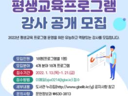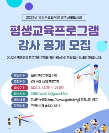 경상북도교육청 영주선비도서관(관장 이철연)은 지역의 우수한 강사를 확보하고 발굴하기 위하여 2022년 평생교육 프로그램 강사를 1월 13일부터 21일까지 모집한다.