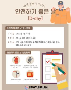 홍성소방서는 반복적으로 발생하는 대형 화재사고의 원천적 차단을 위해 매월 둘째 주 수요일을 ‘안전하기 좋은 날’로 지정·운영한다고 밝혔다.