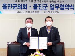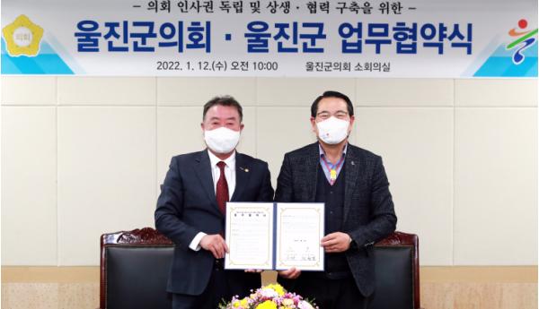 울진군의회는 12일 의회 소회의실에서 지방의회 인사권 독립의 안정적 추진을 위해 울진군과 업무협약식을 가졌다.