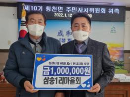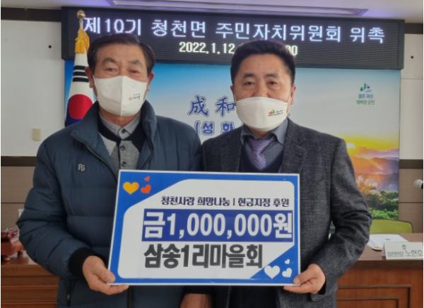 괴산군 청천면은 지난 12일 삼송1리 마을회에서 코로나19 장기화로 어려운 저소득 취약계층을 위해 후원금 100만원을 기탁했다고 밝혔다.