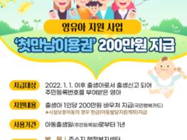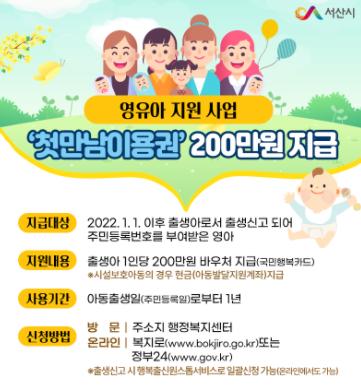 충남 서산시가 올해부터 출생한 모든 아동에게 1인당 200만 원의 ‘첫만남이용권’을 지급한다.
