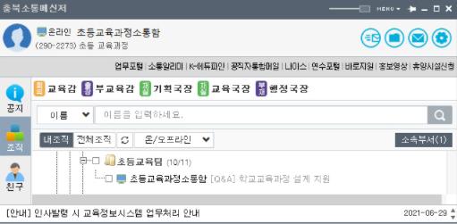 초등 교육과정 소통함은 충북소통메신저 사용자라면 누구나 쪽지와 대화창을 통해 교육과정에 대한 질의할 수 있도록 초등교육팀 내 소통메신저에 개설되었다.
