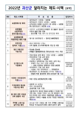 충북 괴산군이 임인년 새해 군민들에게 직접 영향을 미치는 2022년 달라지는 제도 및 시책을 13일 발표했다.
