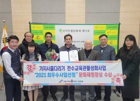 당진시와 기지시줄다리기보존회가 운영하는 기지시줄다리기전수교육관이 2021년 무형문화재 전수교육관 활성화사업 우수기관으로 선정돼 문화재청장을 수상했다고 13일 밝혔다.