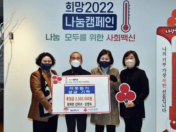 1월 12일 청하면 지역사회보장협의체 위원으로 활동하고 있는 김미녀씨와 송영숙씨는 저소득 가정 등 소외된 이웃을 위해 써달라며 김제시에 이웃돕기성금 200만원을 기탁하여 나눔을 통해 사랑의 온도를 올리는'희망2022 나눔캠페인'에 동참하였다.