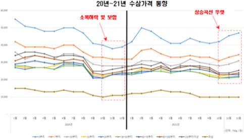 금산군 수삼가격이 2021년 10월부터 12월까지 상승한 것으로 확인됐다.