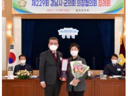 의정봉사대상은 경남지역 기초의회 의원 중 2021년 한해 동안 타의 모범이 되는 의정활동 수행과 지방자치 발전에 현저한 노력을 기울인 의원을 선정해 수여한다.