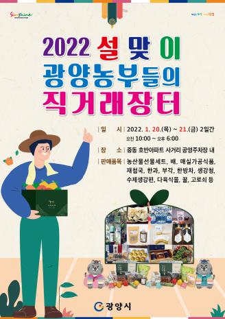 광양시는 2022년 설명절을 맞아 오는 1월 20일부터 이틀간 광양에서 생산되는 우수 농특산물을 안전하게 구입할 수 있는 ‘설맞이 광양농부들의 직거래장터’를 운영한다.