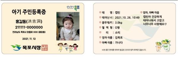 목포시가 아기탄생을 기념하고 출산장려 분위기 확산을 위해 ‘아기주민등록증’ 무료 발급 서비스를 시행한다.