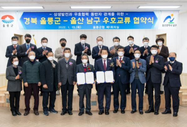 울릉군과 울산 남구는 상호협력과 발전을 위하여 1월 13일 울릉군청에서 우호교류 협약을 체결했다.