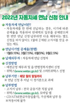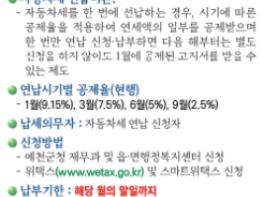 자동차세 연납 제도는 매년 6월과 12월 두 차례 걸쳐 납부해야 하는 자동차세를 한꺼번에 미리 납부하면 9.15% 세액을 공제해 주는 것으로 3월ㆍ6월ㆍ9월에도 신청할 수 있지만 1월에 납부해야 혜택이 가장 크다.