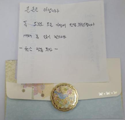 천안 쌍용 주민이라고 남긴 손편지에는 ‘큰돈은 아닙니다. 꼭 조부모 조손가정에 전달 부탁드립니다. 새해 복 많이 받으세요’라고 적혀있었다.