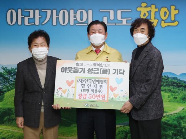 (사)한국연예협회 함안지회는 13일 취약계층을 돕기 위한 이웃돕기 성금 50만 원을 함안군에 기탁했다.
