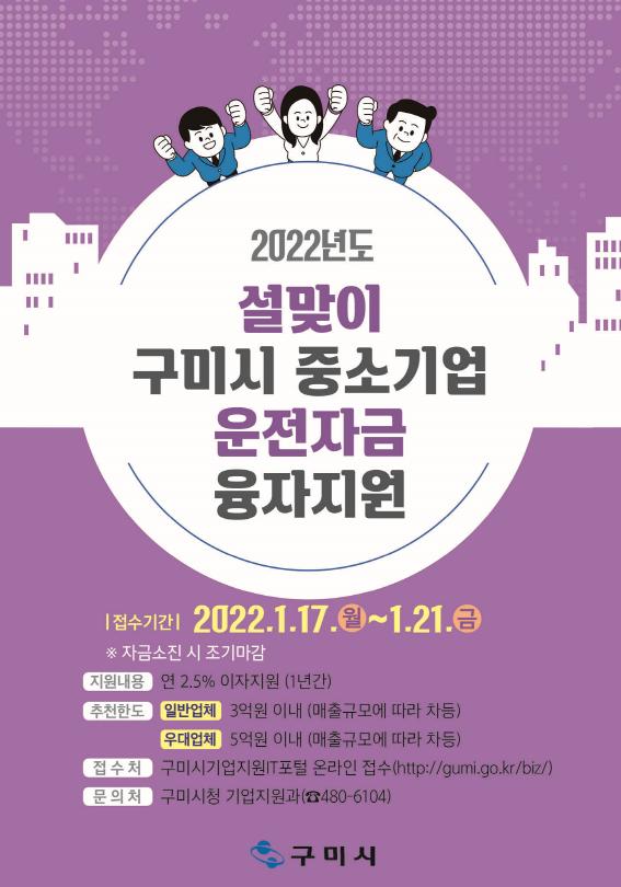 한편 구미시 설맞이 운전자금 신청은 1월 17일부터 1월 21일까지(자금소진 시 조기마감)이며 ‘구미시기업지원 IT포털’로 온라인 신청(비대면)하면 된다. 기타 궁금한 사항은 구미시청 기업지원과로 문의하면 안내받을 수 있다.