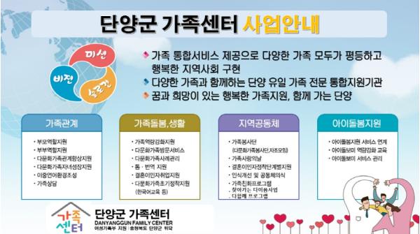 2022년부터 단양군 건강가정·다문화가족지원센터가 “단양군 가족센터”로 명칭이 17글자에서 단 7글자로 변경되었다. 단양군 건강가정·다문화가족지원센터는?건강가정기본법? 제35조에 따른 ‘건강가정지원센터’와 ?다문화가족지원법? 제12조에 따른 ‘다문화가족지원센터’의 기능을 통합 운영하는 기관이다.