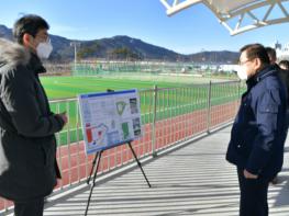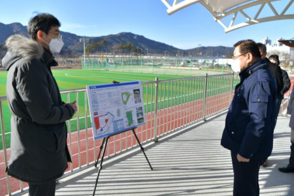 김석환 군수는 먼저, 홍북읍 내포신도시 내 조성된 다목적 운동장 등 체육시설 현장을 점검했다.