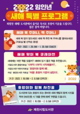 제천시립도서관은 임인년 새해를 맞이하여 도서관에서 즐길 수 있는 행사를 오는 18일부터 2월 6일까지 3주간 진행한다.