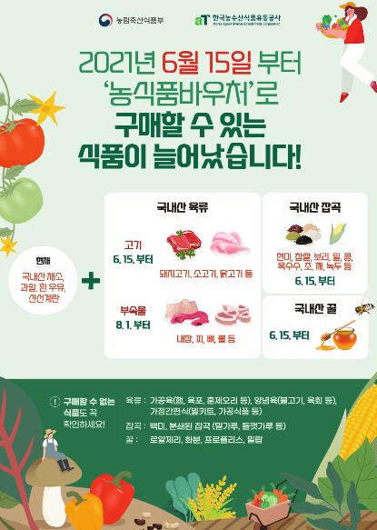 농식품 바우처는 저소득 취약계층의 영양식품 접근성을 높이고 국내산 신선 농산물의 지속 가능한 소비체계를 구축하는 수단으로서 채소, 과일, 육류, 잡곡 등을 구매할 수 있는 전자카드다.