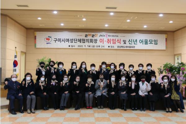 구미시여성단체협의회는 2022. 1. 14 오후 2시 경상북도새마을회관에서 16개 여성단체 회원들이 참석한 가운데 2022년 구미시여성단체협의회 제22대 회장 이?취임식 및 신년 교례회를 개최했다.