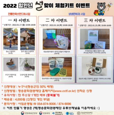 (재)청송문화관광재단은 임인년 새해와 설을 맞아 포스트 코로나 시대를 겨냥해 지역민과 관광객이 집에서 안전하게 즐길 수 있도록 “비대면 지역문화체험키트 이벤트”를 운영한다고 밝혔다.