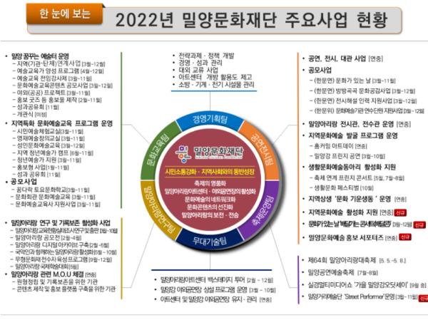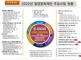 밀양문화재단은 올해 문화예술로 살기 좋은 밀양, 도약하는 밀양을 만들기 위해 2022년도 정책목표를 ‘시민 소통강화와 지역사회와의 동반성장’으로 정하고, 이를 실현하기 위한 전략과제 5개와 주요 실천 사업 21개를 수립했다고 밝혔다.