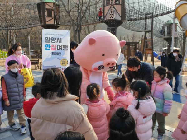 밀양시는 지난 15~16일 이틀간 밀양돼지국밥 캐릭터 ‘굿바비’와 함께 밀양의 주요 관광지를 방문하는 방문객을 대상으로 관광지 방역수칙 준수 및 ‘밀양 안심여행’ 홍보 캠페인을 펼쳤다.