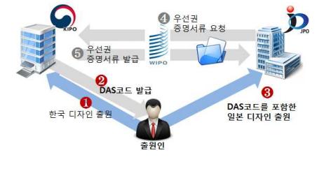 일본에 디자인 출원시 DAS 서비스를 이용하려면, 특허청 홈페이지 ‘특허로’에서 우리나라 디자인 출원에 대한 WIPO 접근코드를 발급받아 이를 일본 특허청에 출원할 때 우리나라 출원 번호와 출원 날짜, WIPO접근 코드를 기재하면 된다.