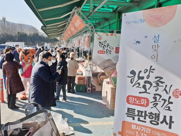 이번 곶감특판은 ‘힐링과 건강의 중심지 함양군’에서 명품 곶감을 생산하는 7개 농가가 참여하였으며, 라이브 커머스, 할인 판매, 증정 이벤트 등 다양한 행사로 인해 첫날 개장식 전부터 사람들이 몰리는 등 북새통을 이뤄 3일간 총 1억 2,000여만원의 판매 실적을 거두었다.