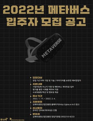 김해시·김해의생명산업진흥원은 우수한 기술과 참신한 아이디어를 가진 예비창업자와 7년 이내 초기 기업을 대상으로 메타버스 입주자를 모집한다고 밝혔다.