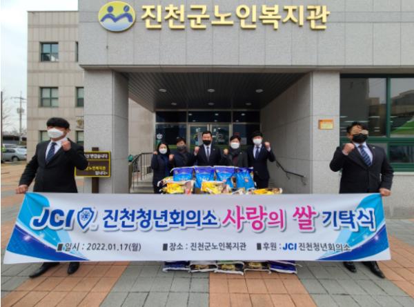 진천군 진천청년회의소 유정화 회장은 17일 코로나19로 추운 겨울을 힘겹게 보내고 있는 지역 어르신들과 소외계층을 위해 사용해 달라며 진천군노인복지관을 방문해 쌀10kg들이 50포대를 기탁했다.