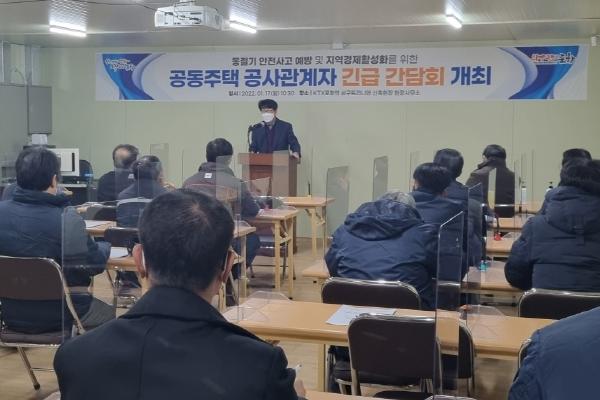 지난 11일 광주 아파트 신축공사 붕괴사고와 관련해 포항시는 17일 북구의 한 아파트 공사현장 안전교육장에서 지역 내 건설 중인 주택건설공사 현장 관계자들을 대상으로 긴급 간담회를 가졌다.