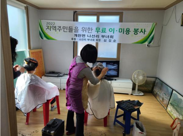 나선리 부녀회는 개천면 나동마을, 청남마을을 방문해 평소 미용실을 이용하기 어려운 지역에 거주하는 어르신들에게 미용 봉사와 함께 어르신들의 말동무를 해드리며 코로나19의 장기화로 지친 마음을 잠시나마 위로했다.