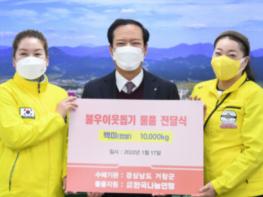 거창군은 17일 사단법인 한국나눔연맹에서 백미 500포(20kg)를 기탁했다고 밝혔다.