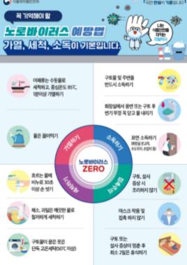아울러 노로바이러스 감염 의심 증상 발생 시 즉시 의료기간 방문 진료를 권하며 타인과 직·간접 접촉을 줄여야 한다고 말했다. 노로바이러스는 감염 환자의 분변과 구토물, 침, 오염된 손을 통해서 감염될 수 있는 만큼 화장실·변기·문손잡이 등은 염소 소독제를 40배 희석(염소 농도 1,000ppm)해 상시 소독해줘야 하는데, 1리터 용기에 소독제 25미리리터와 물 975미리리터를 혼합해 사용하면 된다.