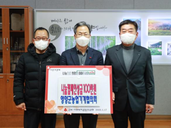 영양군농업기계협의회 일동은 지난 1월 17일 영양군청을 방문하여 저소득 소외계층을 위한 이웃돕기 성금 100만원을 기탁하며‘희망2022 나눔캠페인’에 동참하였다.