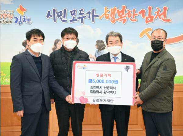 김천시는 법인택시 4개 업체(칠칠택시, 신흥택시, 황악택시, 김천택시)에서 1월 17일 김천시청을 방문해 어려운 이웃을 돕기 위한 성금 5백만 원을 전달했다고 밝혔다.