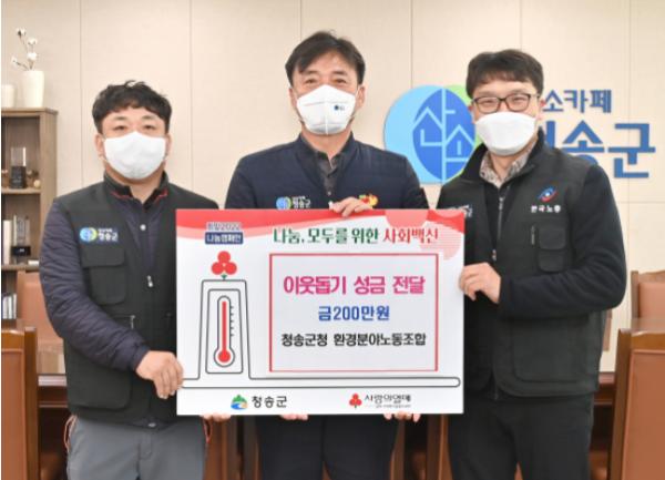 청송군은 지난 1월 17일 청송군청 환경분야노동조합에서 이웃돕기 성금 2백만원을 전달했다고 밝혔다.