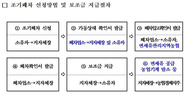 신청대상은 농업경영체 등록을 한 농업인과 농업법인이며, 지원대상 농기계는 농협 ‘면세유 관리시스템’ 기준 등록된 2013년 이전(‘12. 12.31.) 생산 경유 트랙터·콤바인에 한한다.