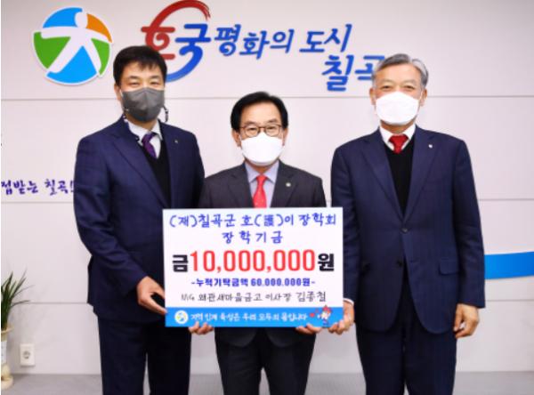 칠곡군은 MG왜관새마을금고에서 지난 17일 지역인재육성과 교육발전을 위해 써달라며 호이장학금 1천만 원을 (재)칠곡군호이장학회에 기탁했다고 밝혔다.