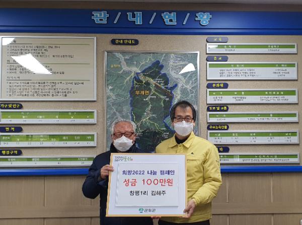 군위군 부계면 창평1리에 거주하는 김해주 님이 18일, 부계면 행정복지센터를 직접 방문하여 희망2022 나눔 캠페인 성금 100만원을 기탁했다.