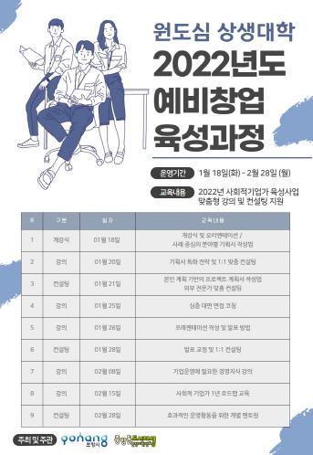 이번 과정은 한국사회적기업진흥원 주관 ‘2022년 사회적기업가 육성사업 창업팀 모집’일정에 맞춰 예비창업자 10개 팀, 30명을 대상으로 지역 내 예비 사회적기업가 창업팀을 육성하는 것을 목표로 한다.