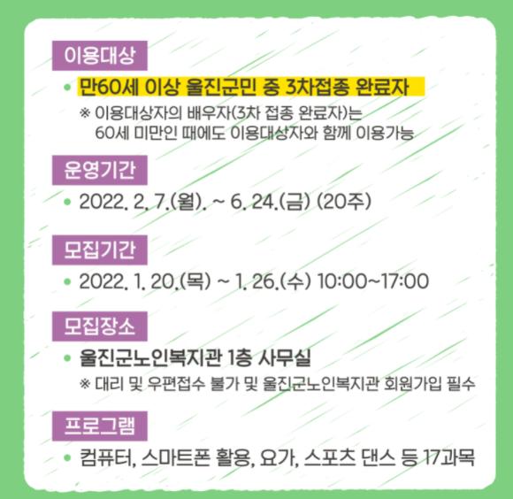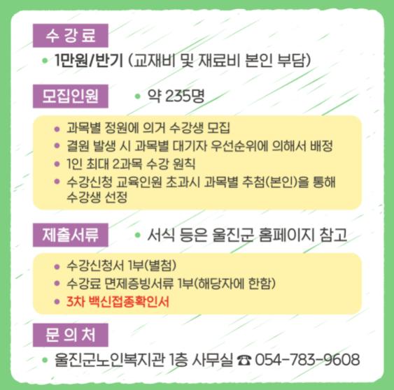 자세한 개설 과목 및 일정, 수강료 등은 울진군 홈페이지의 고시/공고란을 참고하고, 기타 자세한 사항은 울진군노인복지관으로 문의하면 된다.
