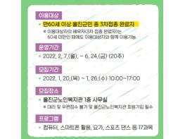 모집 대상은 코로나19 3차 백신접종을 완료한 만60세 이상 어르신들을 대상으로 진행되고 모집인원 초과 시 추첨을 통해 선정되며, 수강 신청은 직접 울진군노인복지관을 방문하여 예방접종증명서를 제출 후 접수할 수 있다.