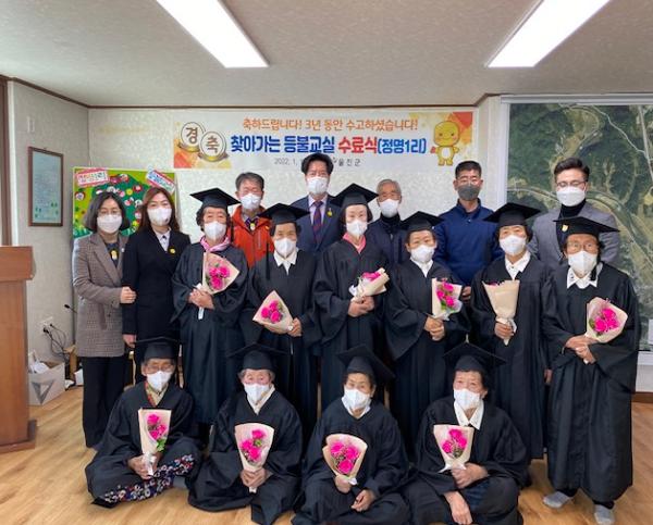 울진군은 지난 17일 울진군 성인문해교육'찾아가는 등불교실'의 3년 과정을 마친 기성면 정명1리의 11명 교육생을 대상으로 수료식을 개최하였다.